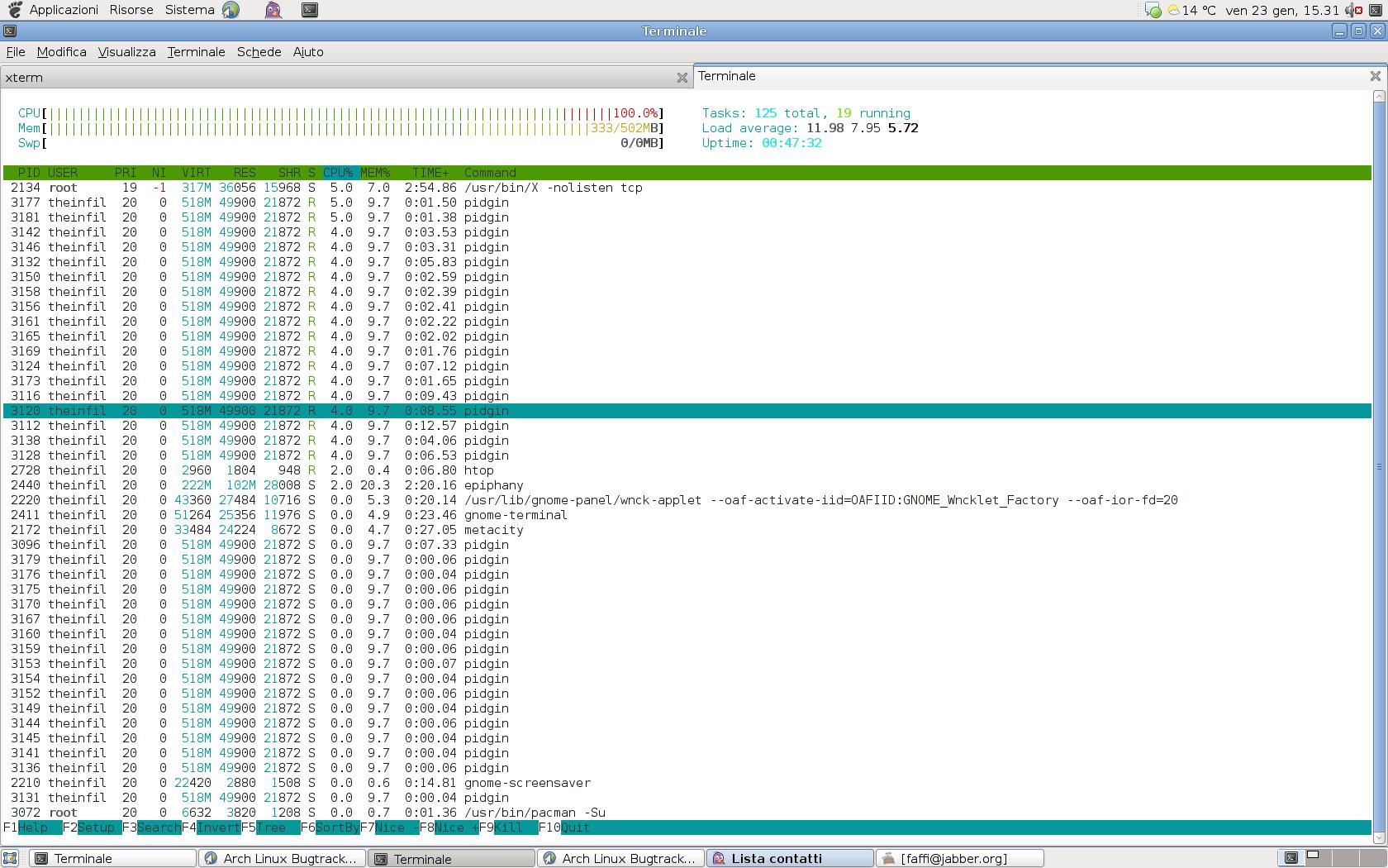 Pidgin multiplies itself istances (up to to 30X) after the connection to jabber or msn. It causes several system slowdown. Additional info: * package version(s) 2.5.3 * config and/or log files etc. Steps to reproduce: Simply open pidgin and connect to msn or jabber account. After few minutes of chat, it start to multiplied his istances. Sorry for the poor english... |