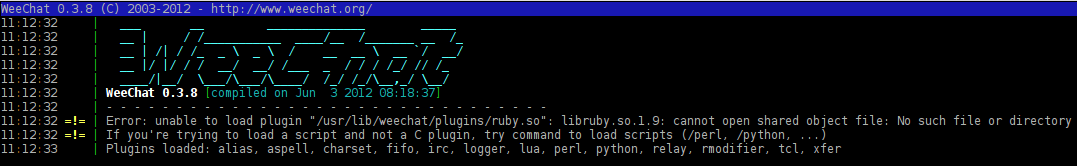 I see errors in weechat-curses main window right after program start: 1. Error: unable to load plugin "/usr/lib/weechat/plugins/ruby.so": libruby.so.1.9: cannot open shared object file: No such file or directory 2. If you're trying to load a script and not a C plugin, try command to load scripts (/perl, /python, ...) Package info: Name : weechat Version : 0.3.8-1 URL : http://www.weechat.org/ Licenses : GPL Groups : None Provides : None Depends On : gnutls curl libgcrypt Optional Deps : perl python2 lua tcl ruby aspell Required By : None Conflicts With : None Replaces : None Installed Size : 4640.00 KiB Packager : Giovanni Scafora <giovanni@archlinux.org> Architecture : x86_64 Build Date : Sun Jun 3 11:18:50 2012 Install Date : Wed Aug 15 13:58:41 2012 Install Reason : Explicitly installed Install Script : No Description : Fast, light and extensible IRC client (curses UI) |