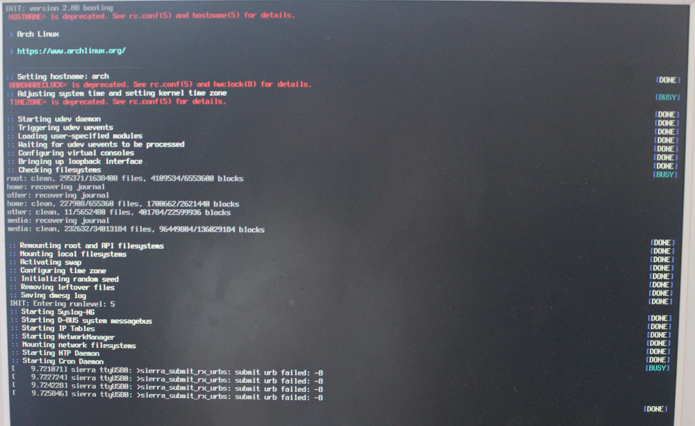 Each time I am powering my PC up it hung. To boot it I need to do hard resets 2-3 times in a row. Happens only if the Sierra wireless device is plugged in. Sometimes PC is booting normally from the first attempt, sometimes I can't boot if for 5-6 times in a row. if I plug the device after log in to the system — PC hung also. Additional info: Arch Linux x86_64 with recent updates. Steps to reproduce: Plug in Sierra device and turn on the PC. |