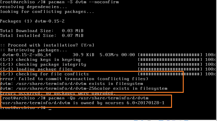 Hi, During a fresh install today I encountered an issue while installing dvtm. The error says some files already exist on the filesystem. The files involved are the following: /usr/share/terminfo/d/dvtm /usr/share/terminfo/d/dvtm-256color After quick investigation, it seems the files are owned by ncurses. I'm not sure this is a bug related to ncurses or dvtm, but from what I understand I'd say they seem to belong to dvtm, so they should not be with ncurses. Best regards. Additional info: * package version(s) dvtm-0.15-2 ncurse-6.0+20170128-1 * config and/or log files etc. following packages were installed beforehand : archlinux-keyring base wget os-prober bash yaourt grub sudo gptfdisk efibootmgr lvm2 device-mapper btrfs-progs net-tools Steps to reproduce: pacman -S ncurses # actually installed with bash pacman -S dvtm pacman -Qo /usr/share/terminfo/d/dvtm |