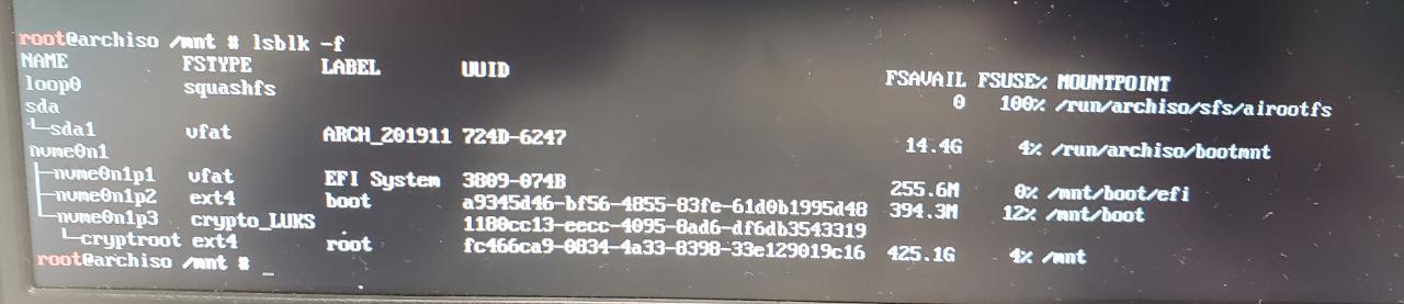 cryptsetup -v -s 512 -h sha512 /dev/... When install arch and reboot does not allow me to enter the password of the encrypted disk. I run the command "fsblk -f" but the UID is the same. |