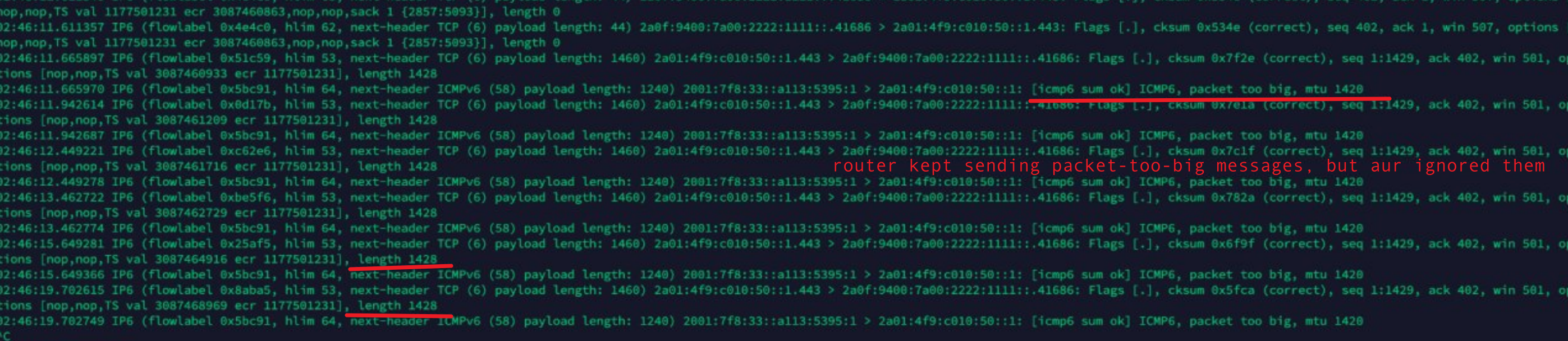 05:11:47.125975 IP6 tserv1.bud1.he.net > aur.archlinux.org: ICMP6, packet too big, mtu 1420, length 1240